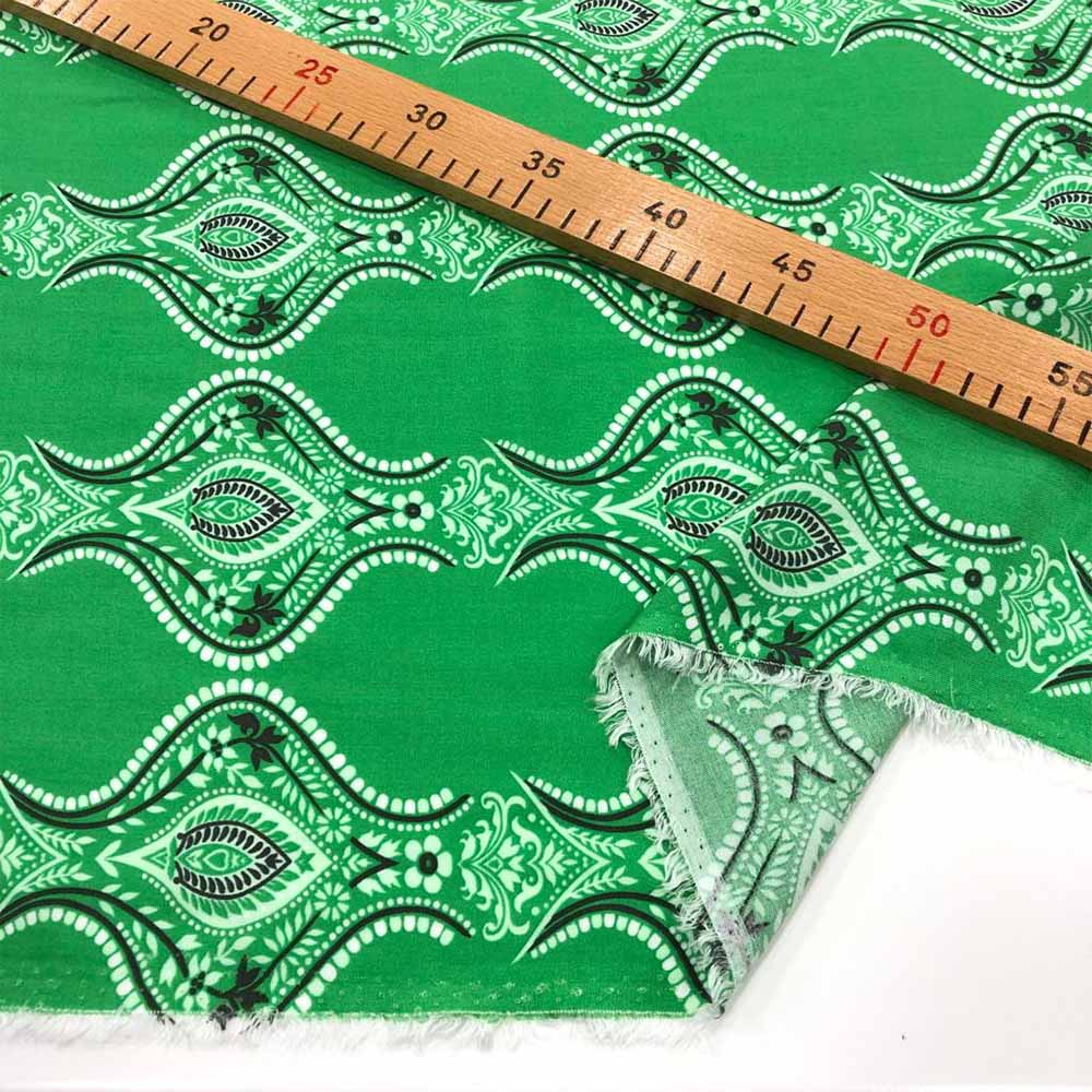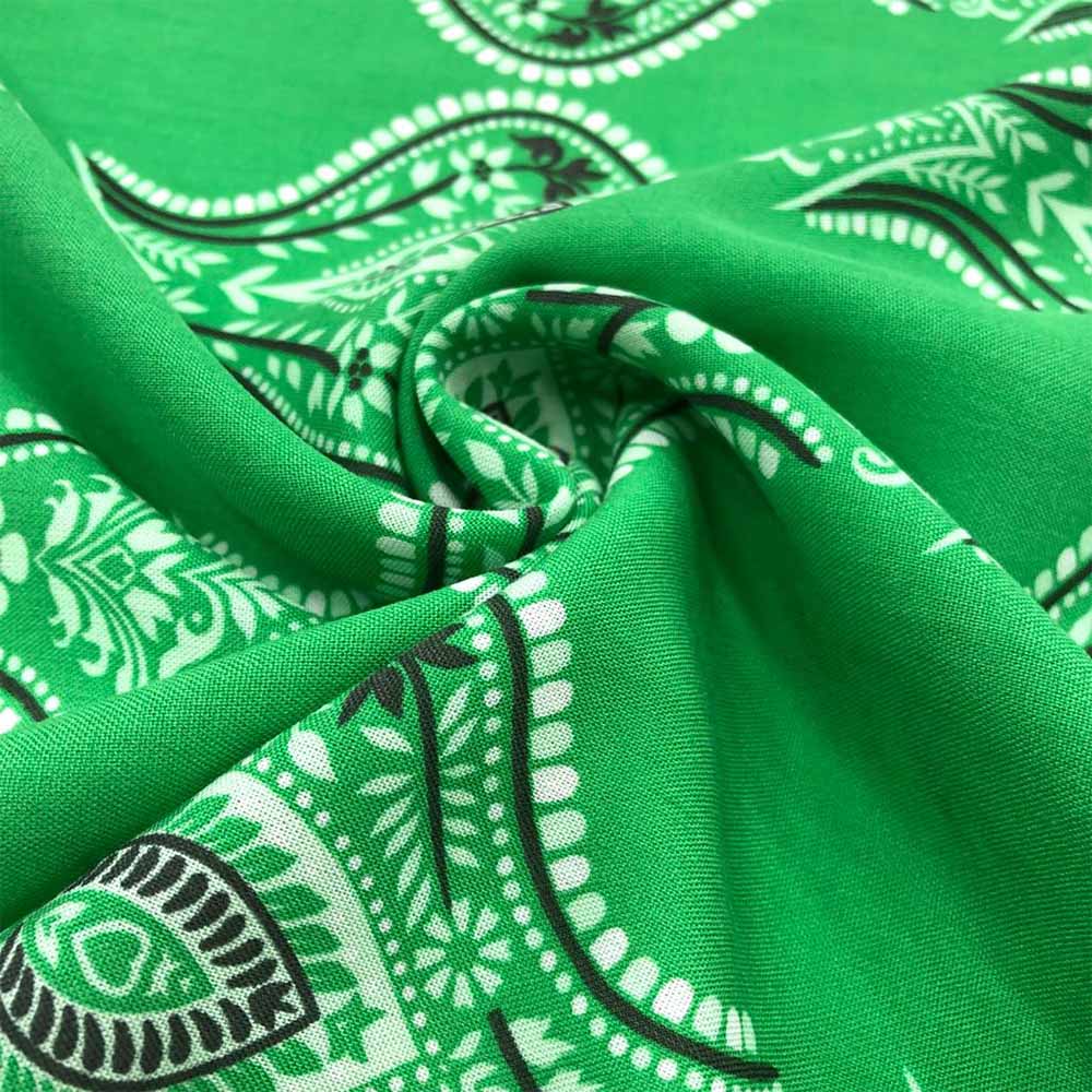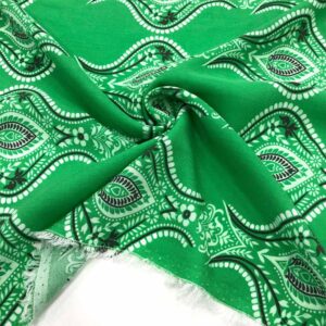 Desenli viskon kumaşımız çift en olup eni 150 cm’dir. Desenli Viskon kumaş dökümlü bir duruşa sahip, içeriğinde naylon, polyester, petrol maddesi bulundurmayan bir kumaştır. Pamuklu olmasından dolayı yakma terletme yapmaz hatta serin tutma özelliği vardır. Ter çekme özelliğine sahiptir. Sıcak havalarda serin ve rahat bir kullanım sağlar. Soğuk havalarda üşümeye sebep olacak etkisi olmaz. Hem yakma terletme yapmaz hem de kırışma yapmaz, dökümlü kumaş olduğu için azda olsa kırışma yapsa bile kendi kendine kırışıklığı düzelir robalı, büzgülü, fırfırlı, serbest pileli, çan, kiloş, vb. modellerde kullanılan iç göstermeyen viskon empirme kumaştır. Dolayısıyla astar istemeyen kullanışlı bir kumaştır. Tüylenme, renk atma gibi sorunlarla karşılaşmayacağınız pamuklu ve dökümlü bir kumaştır. Efil efil elbiselerde sıklıkla tercih edilen viskon kumaş günümüzde oldukça revaçta olan pamuklu kaliteli bir kumaştır. Pamuklu içeriğinden dolayı her yaş kesimine hitap eden sağlıklı bir kumaştır. Yumuşak yapılı sağlıklı bir kumaştır. Yumuşak yapısı sayesinde oldukça fazla tercih edilen ve kullanımı rahat bir kumaştır.
