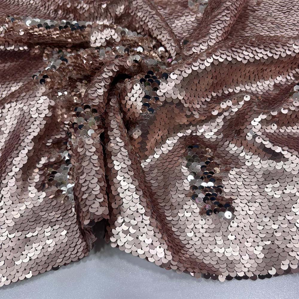 - Işıltılı ve Parlak Yüzey: Kumaşın üzerine işlenen pullar sayesinde ışığı yansıtan ışıltılı bir görünüme sahiptir.