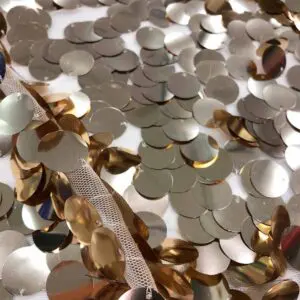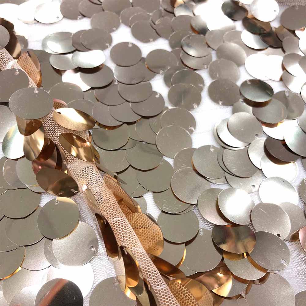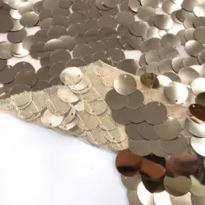 - Işıltılı ve Parlak Yüzey: Kumaşın üzerine işlenen pullar sayesinde ışığı yansıtan ışıltılı bir görünüme sahiptir.